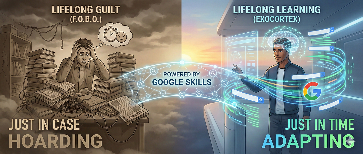 A solução: capacitar as habilidades do Google “Facta sunt potentiora verbis” (Ações são mais poderosas que palavras). Como podemos ver, ações ou práticas são mais poderosas do que apenas uma teoria ou palavras. Hoje em dia existem muitas plataformas de aprendizagem que só nos ensinam as “palavras” (quero dizer Teoria), até Albert Einstein disse:Na teoria, teoria e prática são iguais.Na prática, não são. ― Albert EinsteinO antídoto do FOBO não é ficar e aprender “Just in case”, é “Just in time”.Há uma nova maneira de aprender, capacitando o Google Skills (que anteriormente era Google Cloud Skills Boost e antes disso, Qwiklabs). É um ecossistema abrangente que contém quase 3.000 cursos, laboratórios e credenciais em uma plataforma, incluindo muito conteúdo do Google Cloud, Google DeepMind, Grow with Google e Google for Education em uma plataforma essencial. O Google Skills é um novo lar para aqueles que desejam se tornar seres prontos para o futuro, sempre atualizados, e desenvolver e aprender habilidades em IA, nuvem, etc. você aprendeu com credenciais como emblemas de habilidade, conclusão e certificados e certificações de nível básico. Noventa e seis por cento dos tomadores de decisão planejam investir mais tempo em laboratórios práticos. Ele oferece ajuda e amplas opções gratuitas para alunos de todos os níveis. Aprenda agora, você tem direito a 35 créditos gratuitos todos os meses para se inscrever em laboratórios práticos no Google Skills sem nenhum custo.