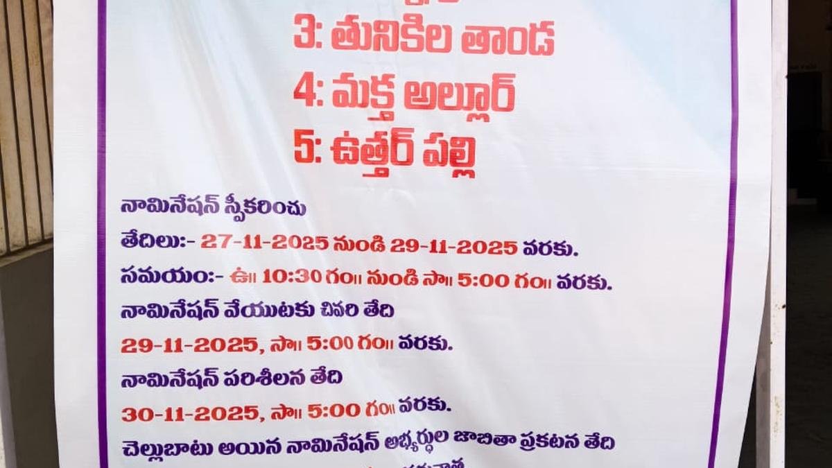 Um banner flexível exibindo detalhes da primeira fase das Eleições Gram Panchayat-2025 foi exibido em um centro de nomeação no distrito de Sangareddy na quinta-feira (27 de novembro de 2025) | Crédito da foto: MOHD ARIF O aviso para eleições para 4.236 Sarpanch e 37.440 cargos de Membros do Distrito, na primeira fase das Eleições Gram Panchayat-2025 em Telangana, foi emitido pelo Oficial de Retorno. A Comissão Eleitoral do Estado de Telangana declarou na quinta-feira (27 de novembro de 2025) que a lista de eleitores será exibida a bordo nos escritórios do Gram Panchayat. As indicações para a primeira fase podem ser feitas de quinta-feira (10h30 às 17h) até as 17h do dia 29 de novembro de 2025, conforme cronograma de votação divulgado na terça-feira (25 de novembro de 2025). A lista dos candidatos concorrentes seria publicada em 3 de dezembro de 2025. Um centro de recebimento de nomeações em Kandi, distrito de Sangareddy | Crédito da foto: MOHD ARIF As eleições do Gram Panchayat seriam realizadas em três fases; enquanto a primeira fase de votação seria realizada em 11 de dezembro, a segunda e terceira fases subsequentes em 14 e 17 de dezembro, respectivamente. Há um total de 12.278 panchayats de aldeia e 1,12 lakh distritos. Enquanto isso, a atividade relacionada à votação começou em vários distritos. Gram Panchayats foram divididos em grupos para receber as indicações. No distrito de Sangareddy, os locais foram anunciados e os preparativos foram feitos lá. Coletor do distrito de Vikarabad e observador geral, Shaik Yasmeen Basha, inaugura um centro de mídia na quinta-feira | Crédito da foto: POR ARRANJO Um Centro de Mídia foi inaugurado pelo Colecionador de Vikarabad, Prateek Jain, e pelo Observador Geral, Shaik Yasmeen Basha, no distrito na quinta-feira. A observadora distrital de Nirmal para as urnas, Ayesha Masrat Khanam, e o coletor distrital, Abhilasha Abhinav, inspecionaram um centro de recebimento de nomeações no Centro Vadyal Gram Pancyat em Laxmanchand Mandal. A observadora distrital de Nirmal, Ayesha Masrat Khanam, e o coletor distrital, Abhilasha Abhinav, inspecionaram um centro de recebimento de nomeações na quinta-feira | Crédito da foto: POR ARRANGEMENT Publicado – 27 de novembro de 2025 13h58 IST