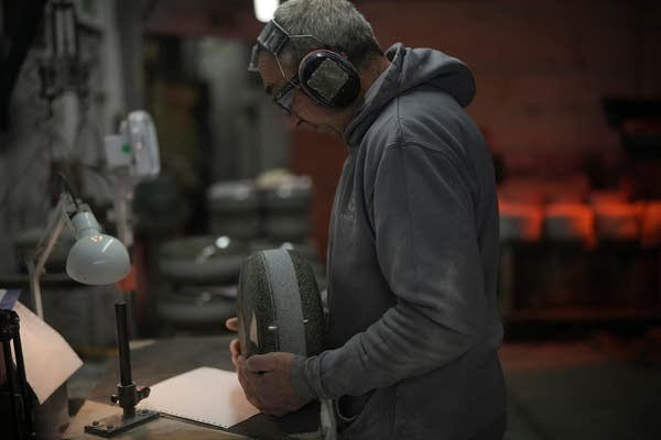 A craftsman checks a curling stone during a quality control phase at Kays Curling stone factory in Mauchline, Scotland, Nov. 11.