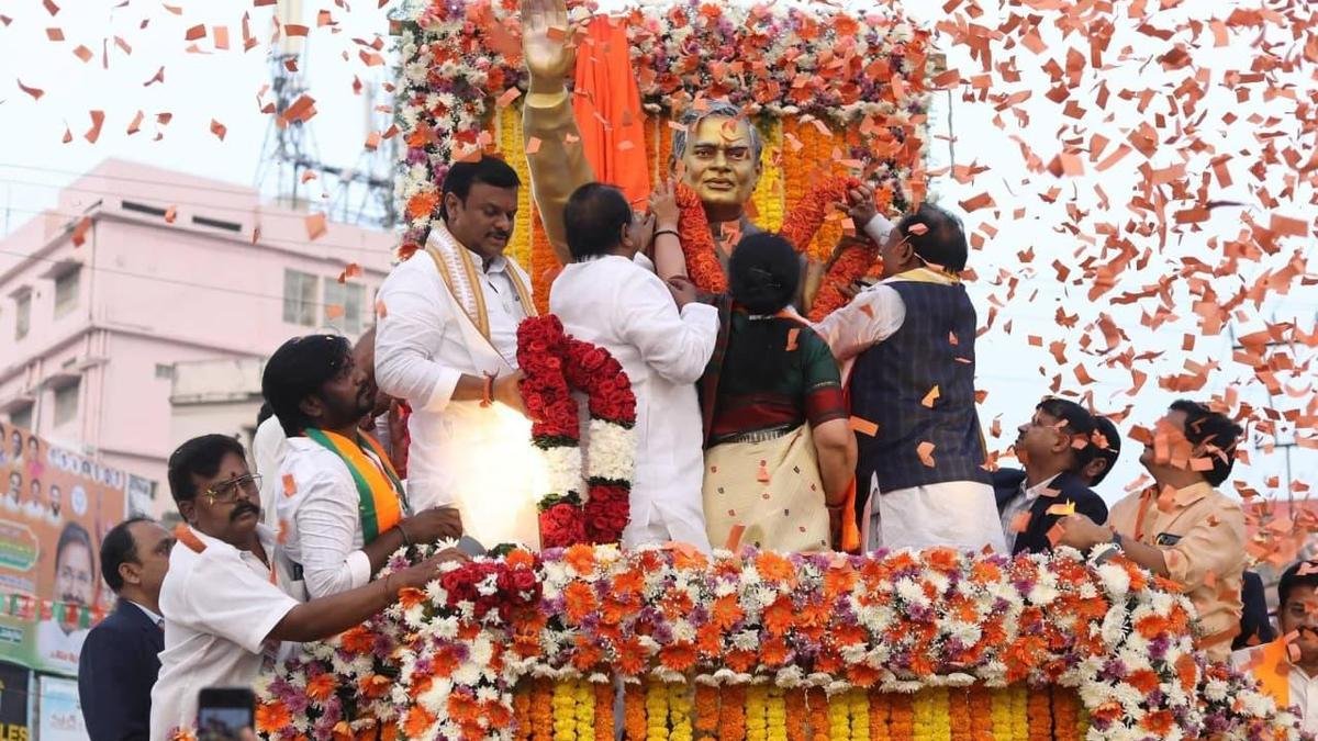O ministro-chefe de Chhattisgarh, Vishnu Deo Sai, e o ministro de Estado da União para Siderurgia e Indústrias Pesadas, B. Srinivasa Varma, inauguraram a estátua de bronze do ex-primeiro-ministro Atal Bihari Vajpayee em Rajamahendravaramn no domingo. | Crédito da foto: POR ARRANJO O ministro-chefe de Chhattisgarh, Vishnu Deo Sai, disse no domingo que o Estado se moveria em direção a Vikasit Chhattisgarh, já que as operações anti-Naxal lideradas pelo Centro provavelmente eliminariam em breve os maoístas da região. Chhattisgarh continuou a sofrer atraso apesar de ser rico em florestas e recursos minerais devido ao extremismo de esquerda. Ele agradeceu ao Primeiro-Ministro Narendra Modi e ao Ministro do Interior da União, Amit Shah, pelo seu compromisso e apoio na eliminação da violência maoísta. O Ministro-Chefe, acompanhado pelo Ministro de Estado da União para as Indústrias Siderúrgicas e Pesadas, B. Srinivasa Varma, e o presidente do Estado de Andhra Pradesh, PVN Madhav, inauguraram a estátua de bronze como parte do programa comemorativo. A via expressa de seis pistas Raipur – Visakhapatnam reduziria o tempo de viagem em cerca de cinco horas entre Raipur e Visakhapatnam. A via expressa está em construção e deverá ser concluída até o final de 2026. Ele disse que a capital administrativa de Chhattisgarh foi nomeada Atal Nagar como um sinal de respeito a Vajpayee, que foi fundamental na criação do Estado. Ele acrescentou que o governo decidiu nomear 100 parques em Chhattisgarh em homenagem a Vajpayee em 25 de dezembro e garantir que cada cidade tivesse pelo menos uma rua com seu nome. Relembrando o legado de Vajpayee, o Sr. Vishnu Deo Sai disse que o ex-primeiro-ministro criou um Ministério único para o Bem-Estar Tribal. Srinivasa Varma, Madhav e outros líderes do BJP disseram que a crença de Vajpayee de que Andhera chhatega, suraj niklega e kamal khilega continuariam a inspirar o partido. Atal – Modi Suparipalana Yatra na cidade. Publicado – 21 de dezembro de 2025 20h52 IST