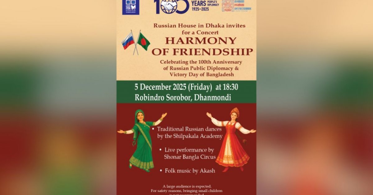 A Casa Russa em Dhaka realizará um concerto cultural intitulado “Harmonia da Amizade: Comemorando o 100º Aniversário da Diplomacia Pública Russa e o Dia da Vitória de Bangladesh”. O concerto será realizado no Robindro Sorobor em Dhanmondi às 18h30 de sexta-feira. apresentações artísticas, oferecendo ao público uma rica experiência cultural e promovendo conexões entre pessoas. A Casa Russa convidou o público a participar do evento, acrescentando que a entrada é aberta a todos.