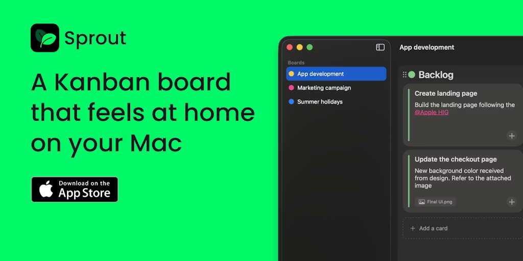 Há alguns meses comecei a procurar um quadro kanban simples para gerenciar todas as minhas tarefas, pois estava ficando louco com a carga de trabalho que tinha. Passei semanas procurando um que fosse privado, offline, que não estivesse cheio de recursos inúteis. Então criei o Sprout , um quadro Kanban simples e nativo para Mac. – Sem contas – Sem ruído (0 notificações, anúncios, recursos inúteis) – 100% privado (usa CoreData e iCloud).